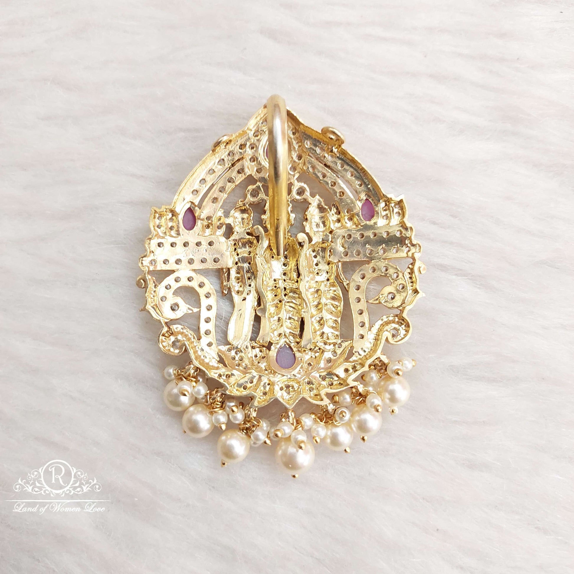 92.5 Silver Jewelry Beautiful Ramparivaram Locket Designs With White Stones Middle Kempu Stones With 22k gold coating with Hanging pearls With 2.2" inches.From Ramalacollections