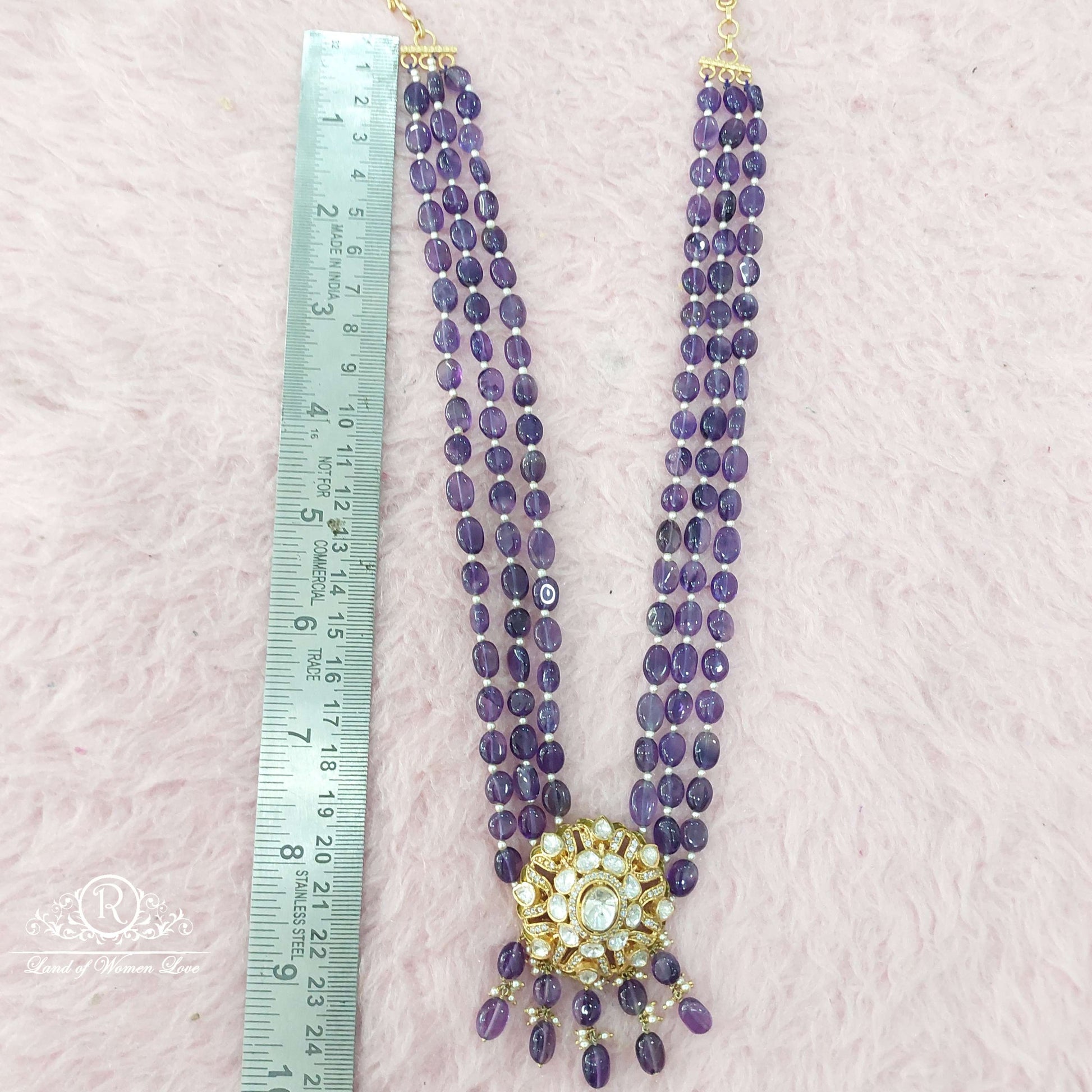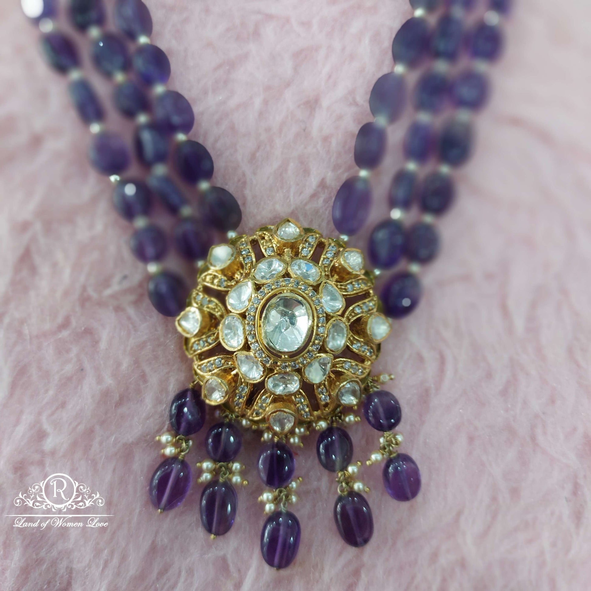 92.5 Silver Jewelry Beautiful 3 Lines Purple colour Real Beads Mosiznites Chocker Designs With 22k gold coating With Hanging Beads With 25" Inches. From Ramalacollections