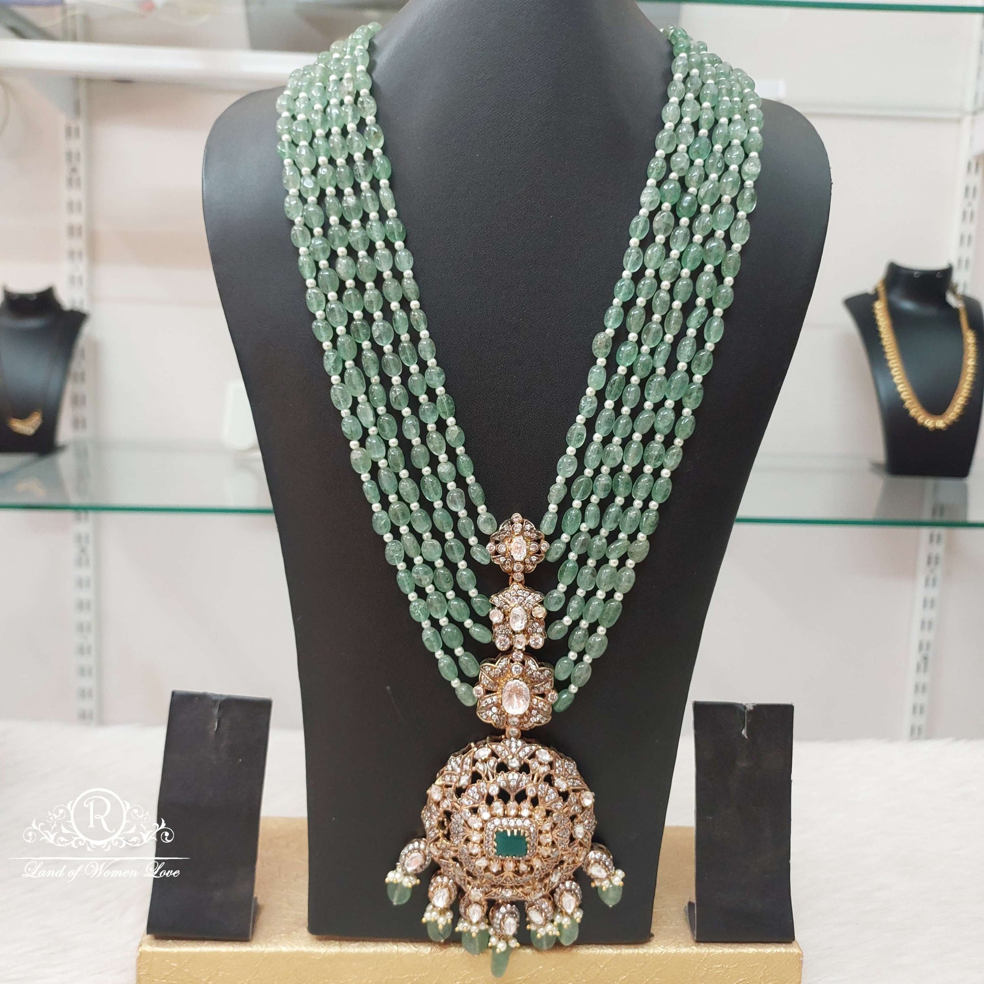 92.5 Silver Jewelry Beautiful 6 Line Real Beads Rani Haram With Victoria Locket Designs With White Stones Middle Green stones With 22k gold& Black coating with Hanging pearls With 28" Inches.From Ramalacollections