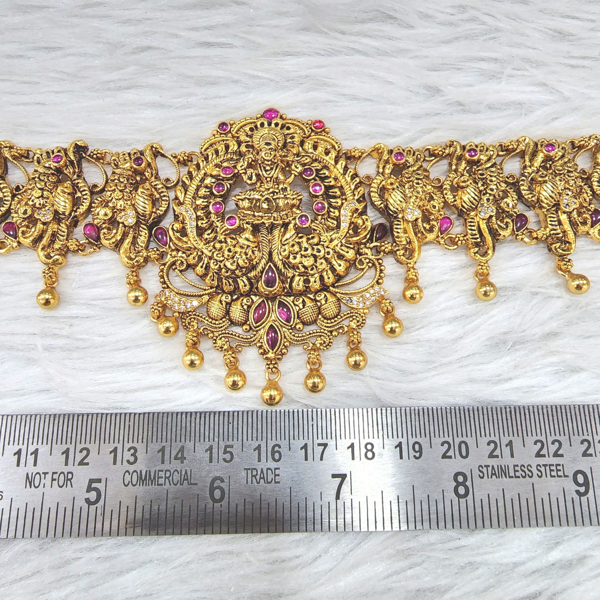 92.5 Silver Jewelry Beautiful Nakshi Lakshmi Devi Vaddanam Peacock Designs With White & Kempu Stones With 22k Gold Coating Hanging Silver Gold Balls.From Ramalacollections