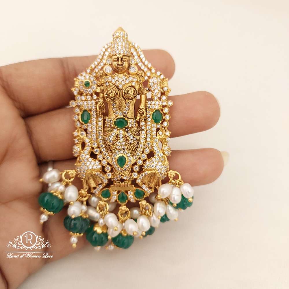 92.5 Silver Jewelry Beautiful God Venkateswara Swamy pendant Designs With 22k Gold coating With White Stones middle Green stones With 3" Inches Hanging Pumpkin Beads with Pearls. From Ramalacollections