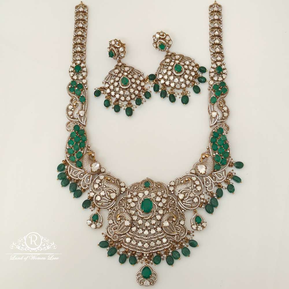 92.5 Silver base gold polish beautiful Victorian Moissanite Peacock Design Earring with white stones middle green stones with hanging beads back side screw model 3 inches length design by ramalacollections