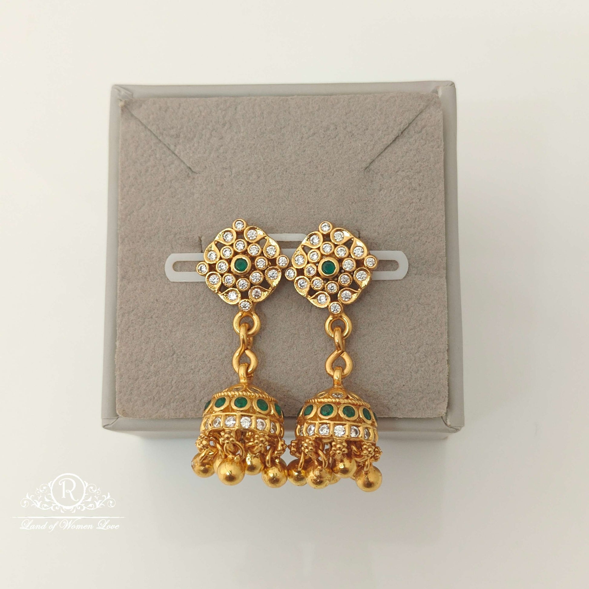 92.5 Silver base gold polish beautiful jhumka Earrings design with green & white stones with hanging silver gold balls back side screw model 1.6 inches length design by ramalacollections