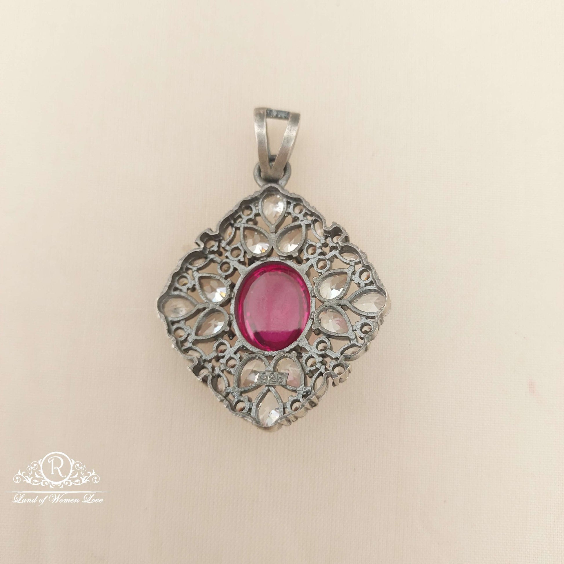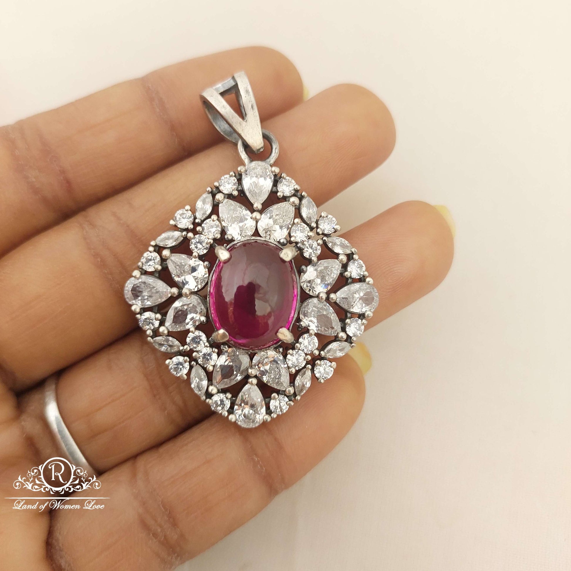 Oxidised Silver Jewelry Beautiful Locket Designs With White Stones Middle Kempu Stone With 1.6" Inches Hanging Silver Balls From Ramalacollections