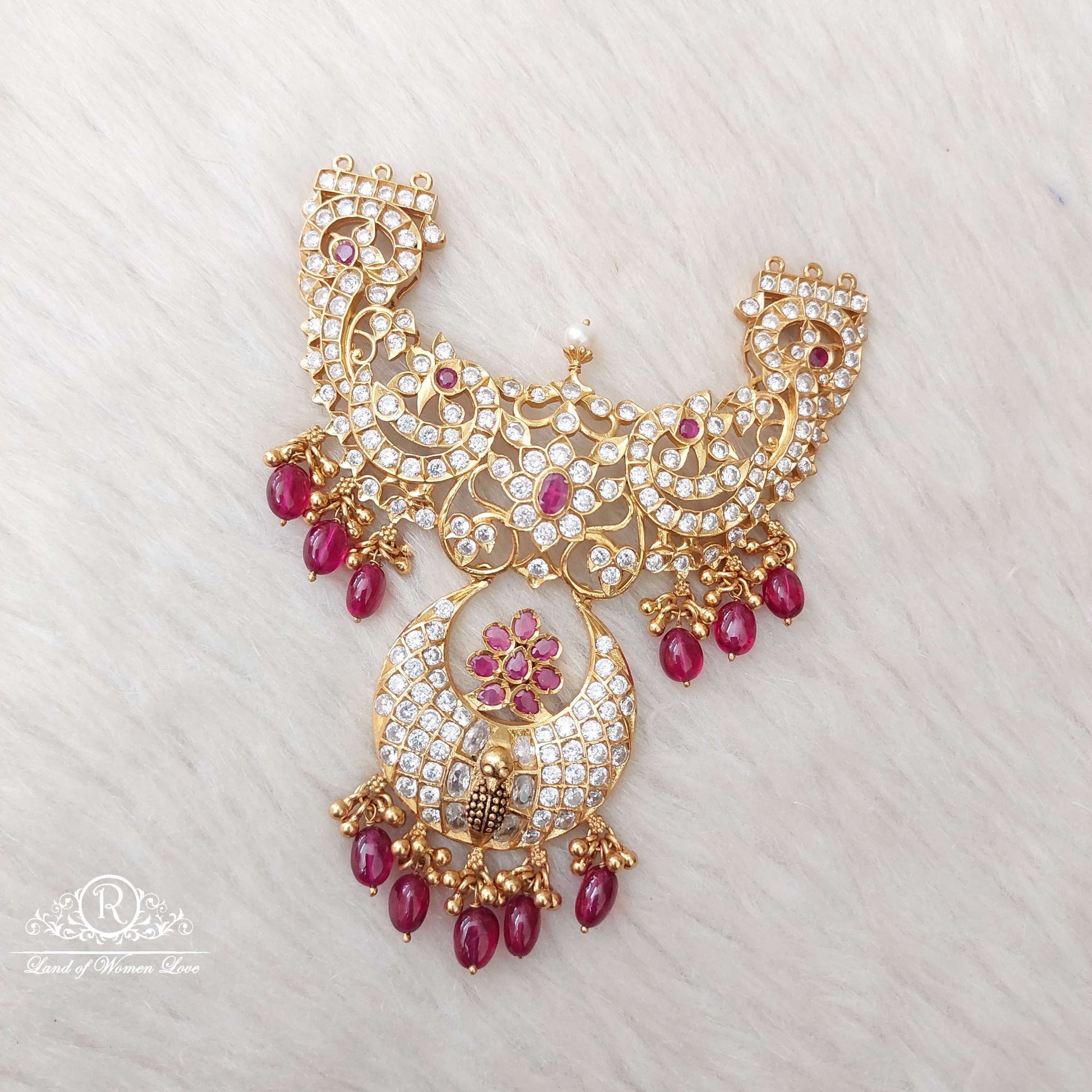 92.5 Silver Jewelry Beautiful Big Locket Peacock Designs With Full Of White stones with Middle Kempu Stone With 22k Gold coating Hanging Silver Gold Balls & Beads With 4.5" Inches. From Ramalacollections