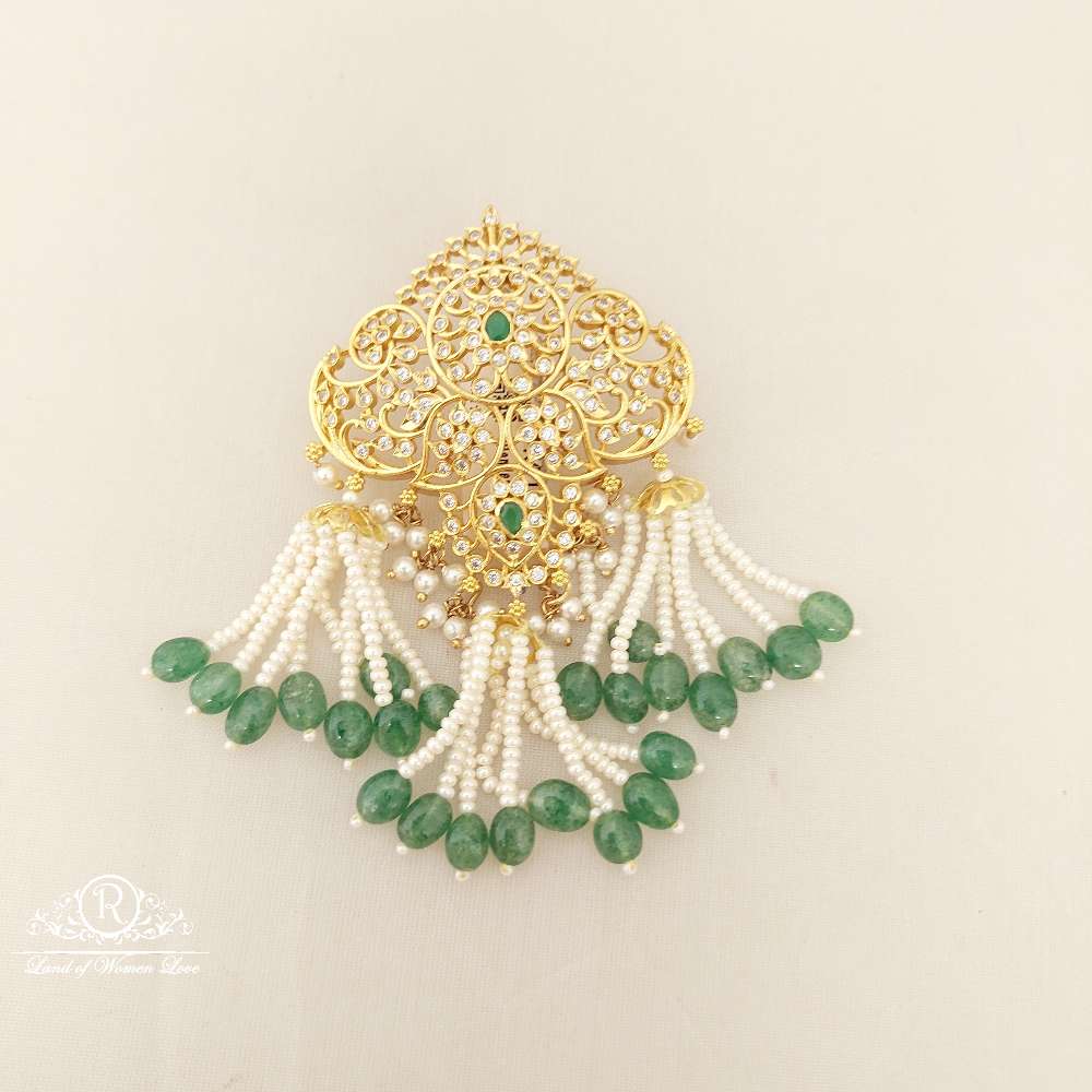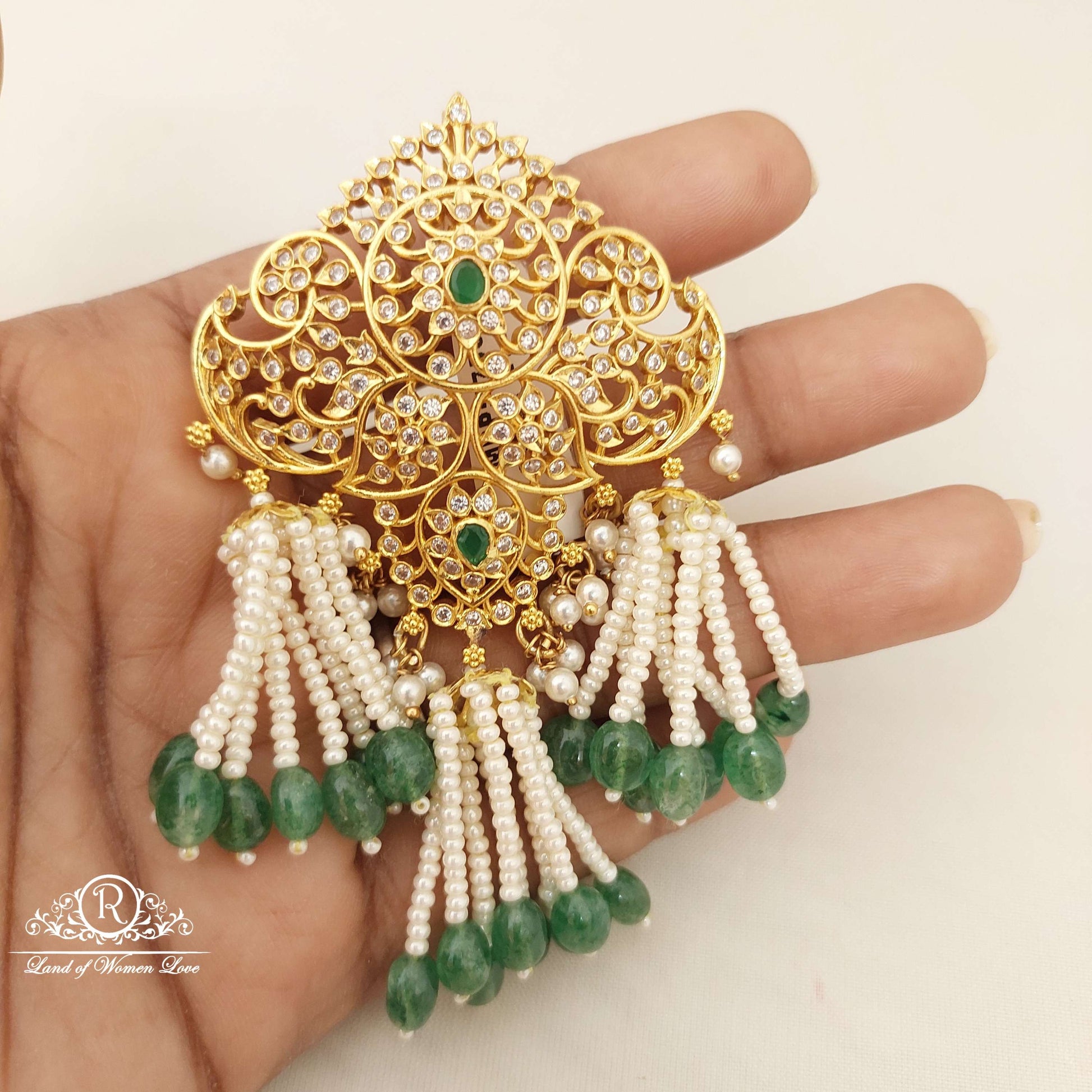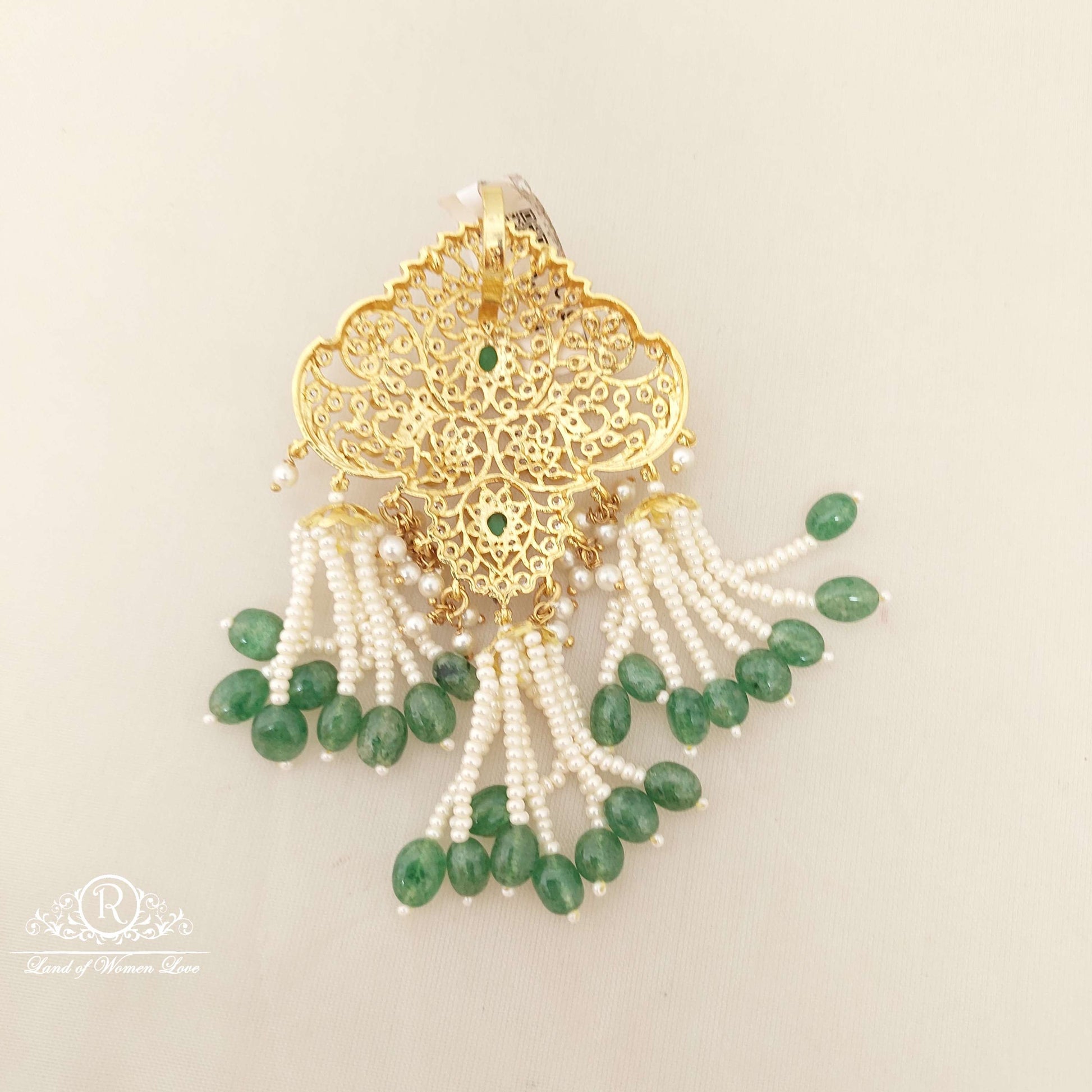 92.5 Silver Jewelry Beautiful White Stones Locket Designs With 22k Gold Coating With middle Green stone With hanging pearls With 3" Inches. From Ramalacollections