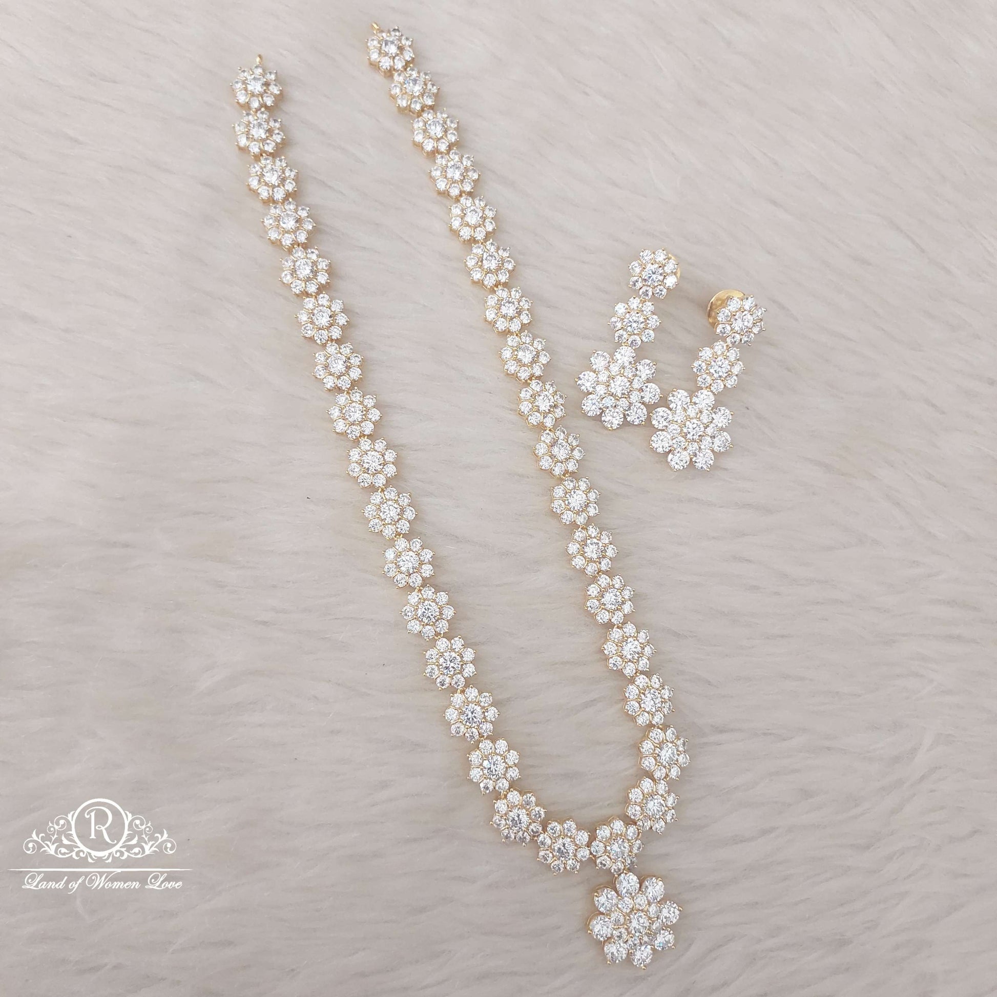 92.5 Silver Jewelry Beautiful White Stones Necklace With Earrings Flower Designs With With 22k Gold coating With 19" inches Earrings Back Said Screw Type. From Ramalacollections