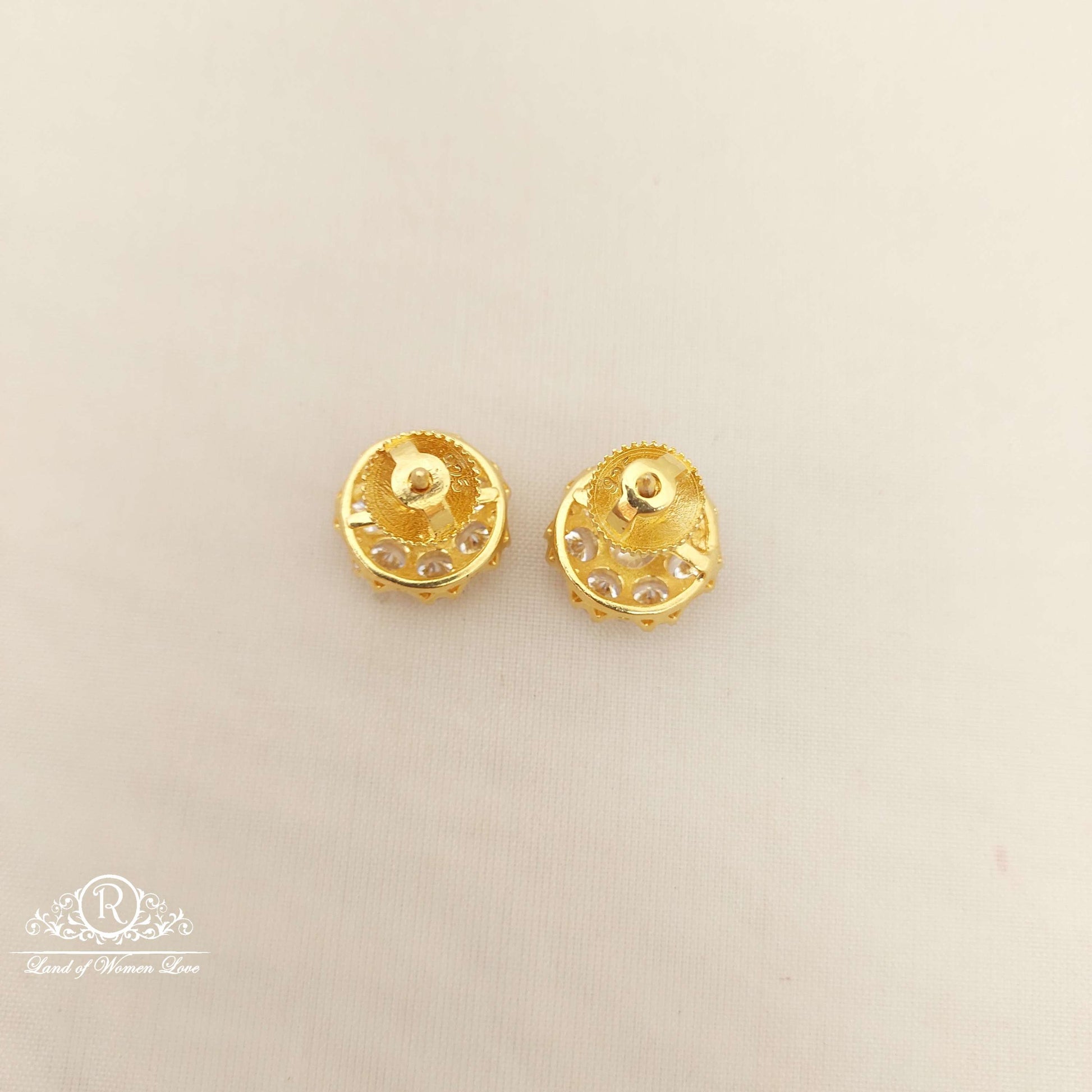 92.5 Silver Jewelry Beautiful Stud Earrings Designs With 22k Gold Coating With White Stones With Back Side Screw Model. From Ramalacollections
