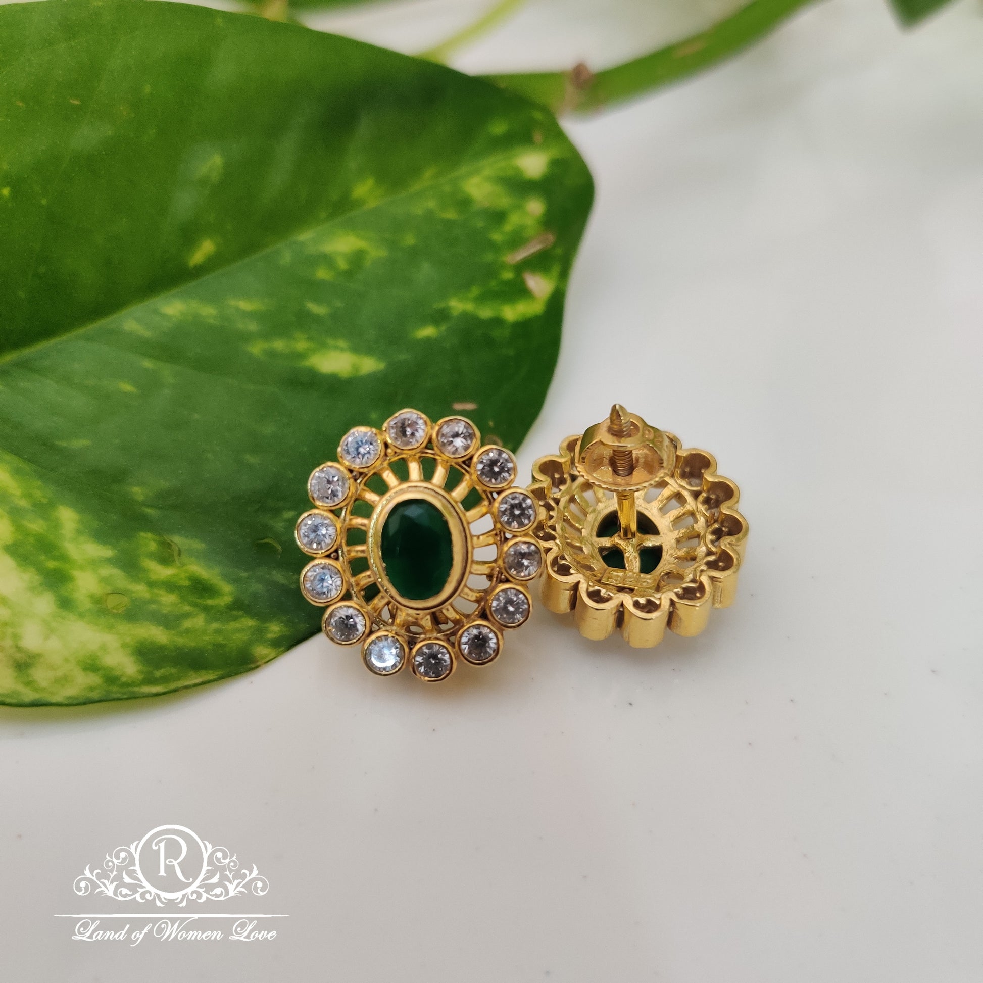 Oxidised Silver Jewelry Beautiful Stud Earrings Designs With White Stones Middle Green Stone With BackSide Screw Type From Ramalacollections