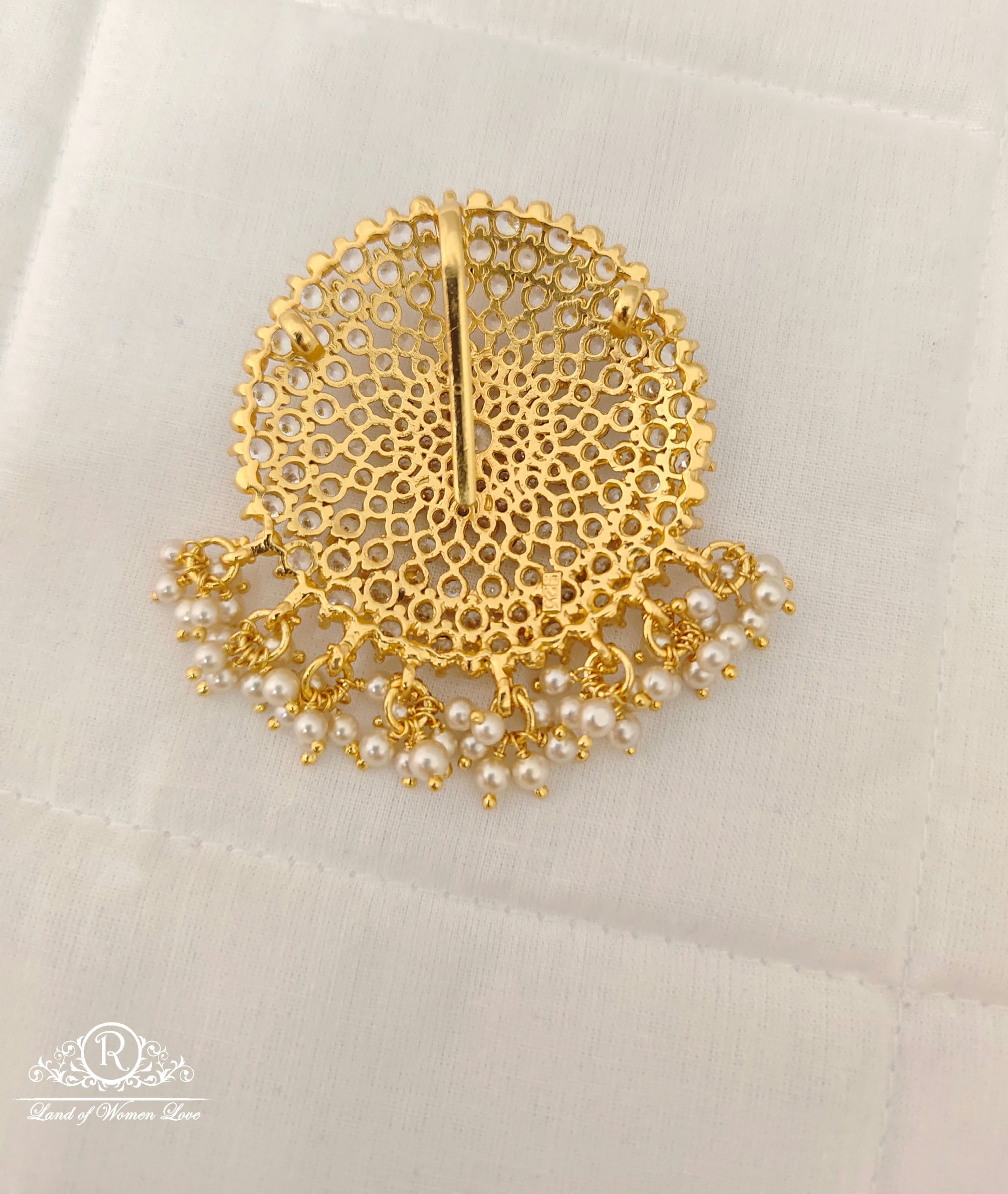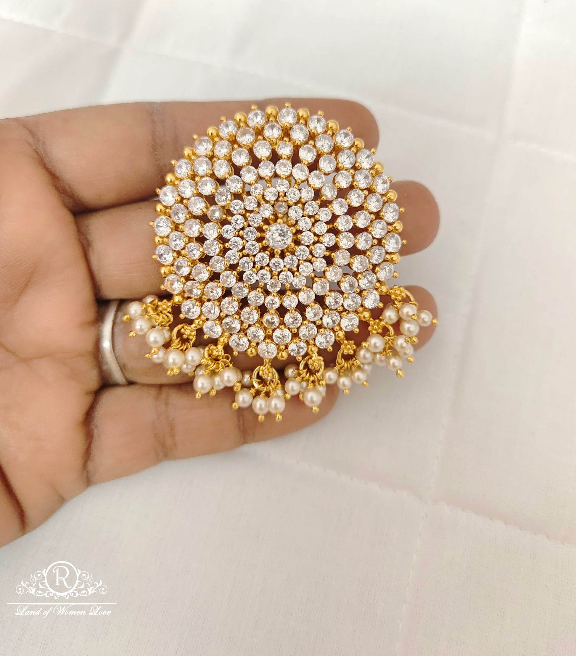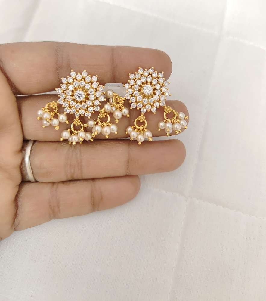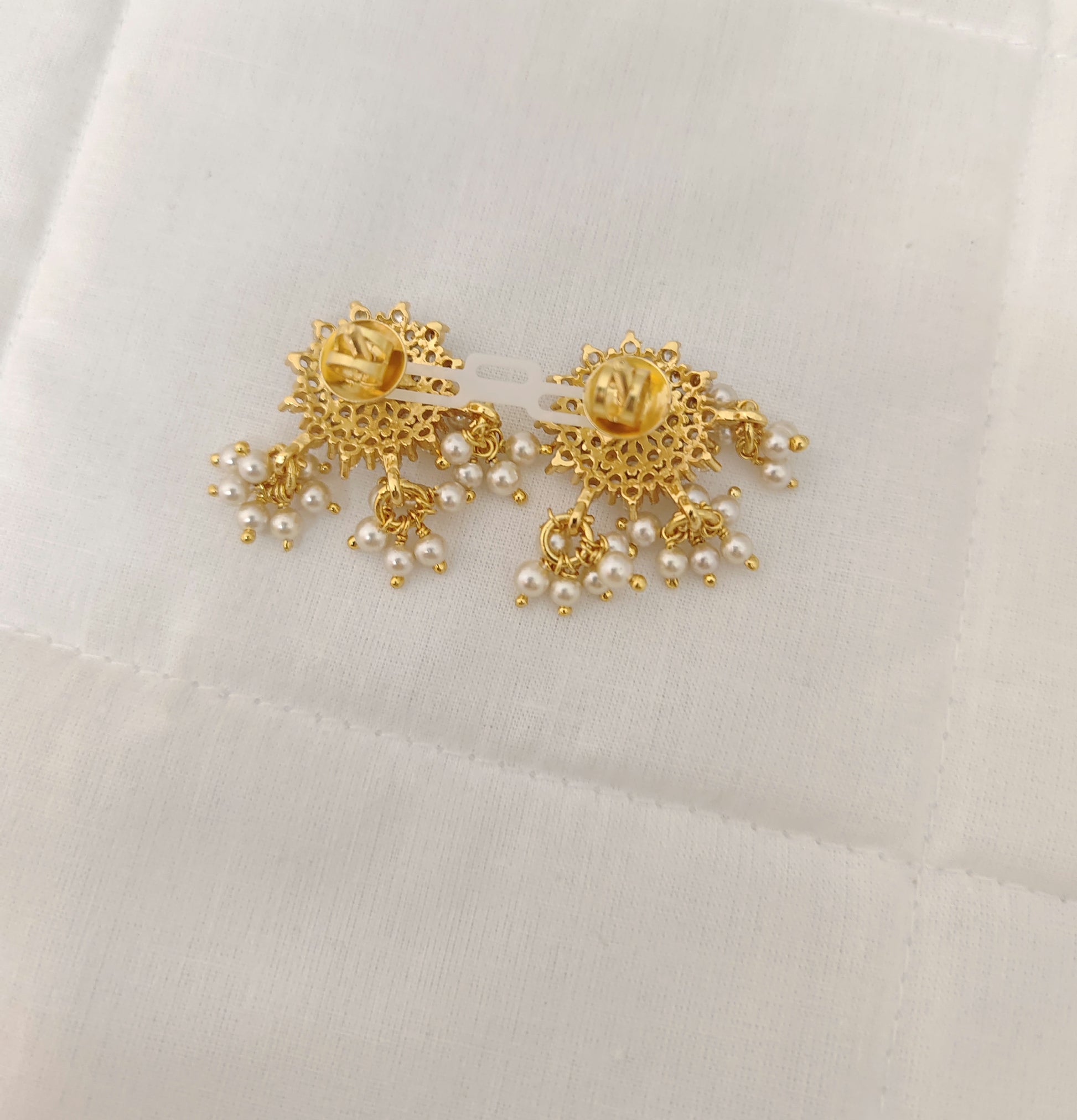 92.5 Silver Jewelry Beautiful White Stones Locket With Matching Earrings Designs With 22k Gold Coating With Hanging Pearls With 2" Inches Backside Openable Hook. From Ramalacollections
