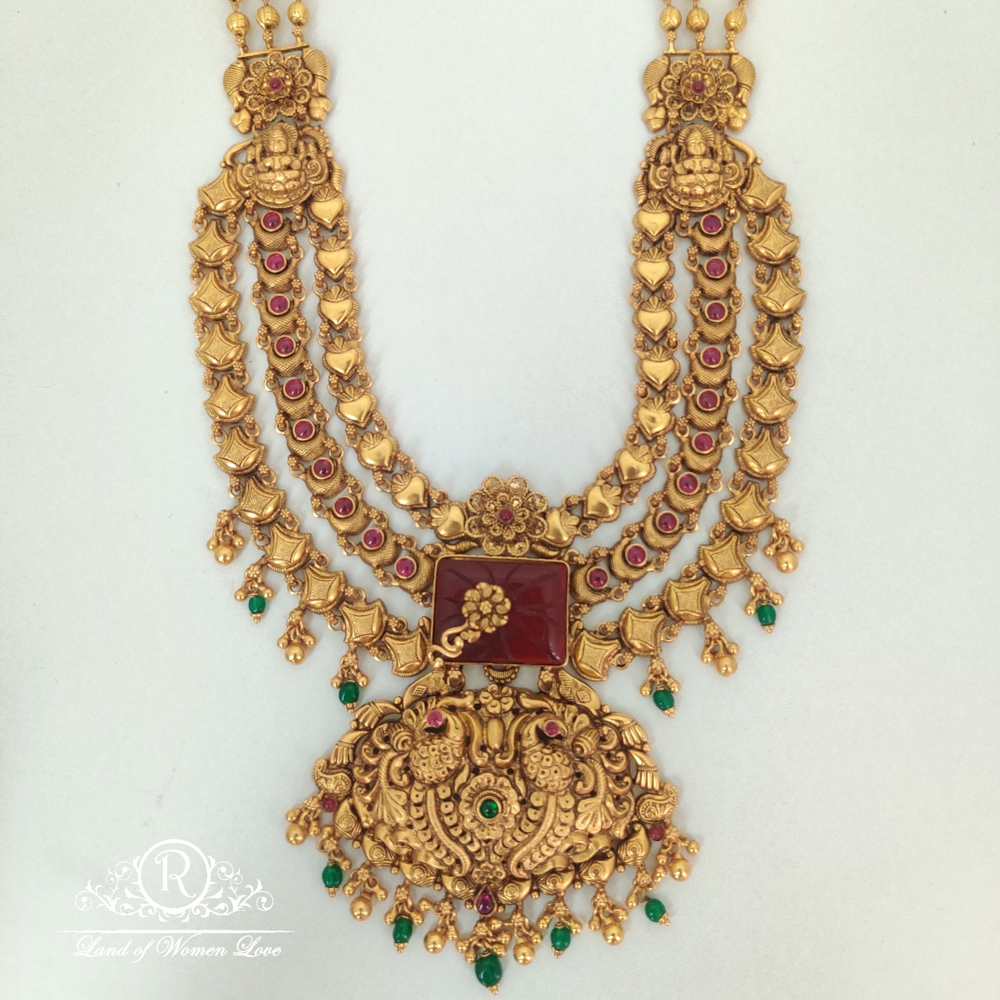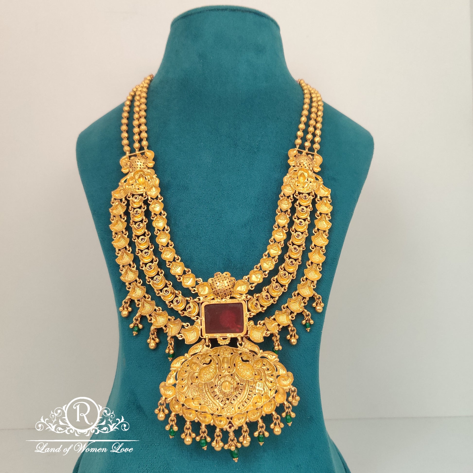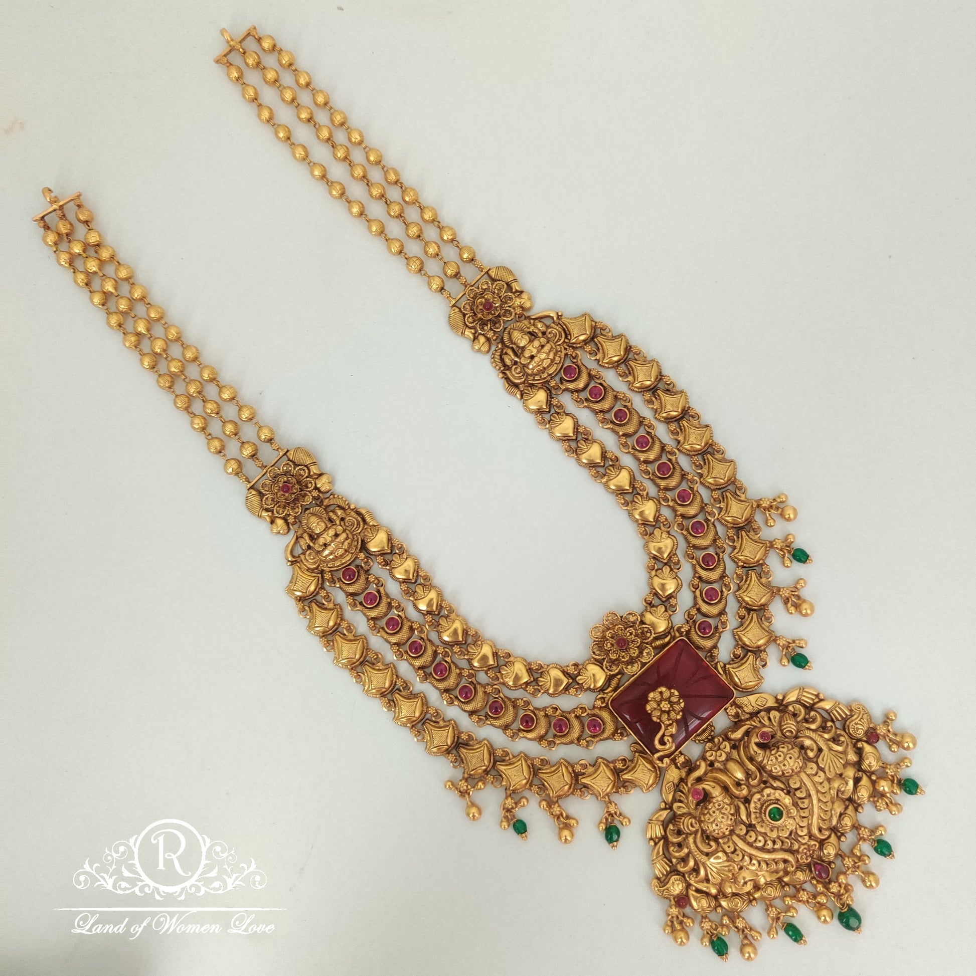 92.5 Silver base 22k gold polish Three steps peacock, flower design haram with side gold balls hanging coloured beads and pearls with 24 inches from Ramala Collections ✨